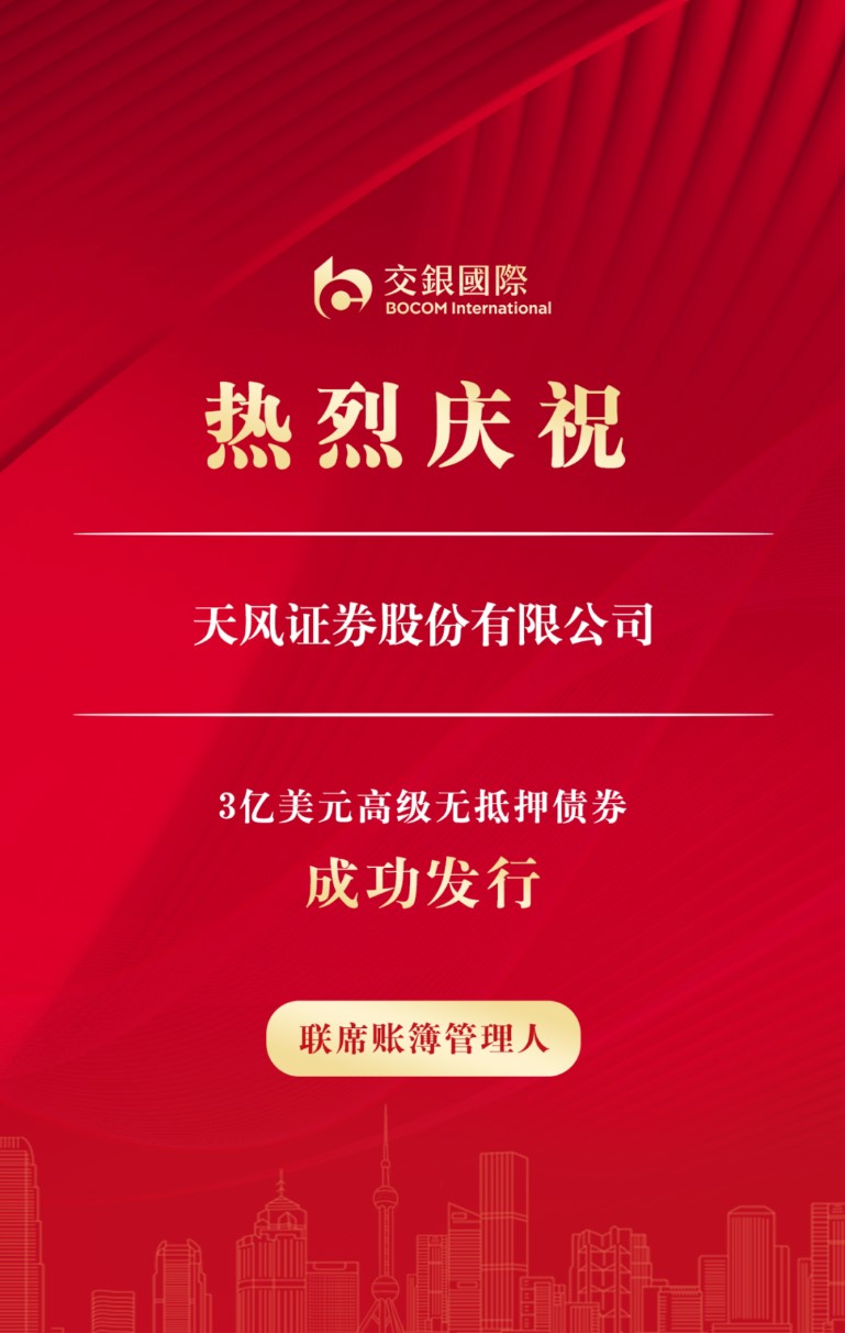 交銀國際助力天風證券及陝西金資成功發行境外債券