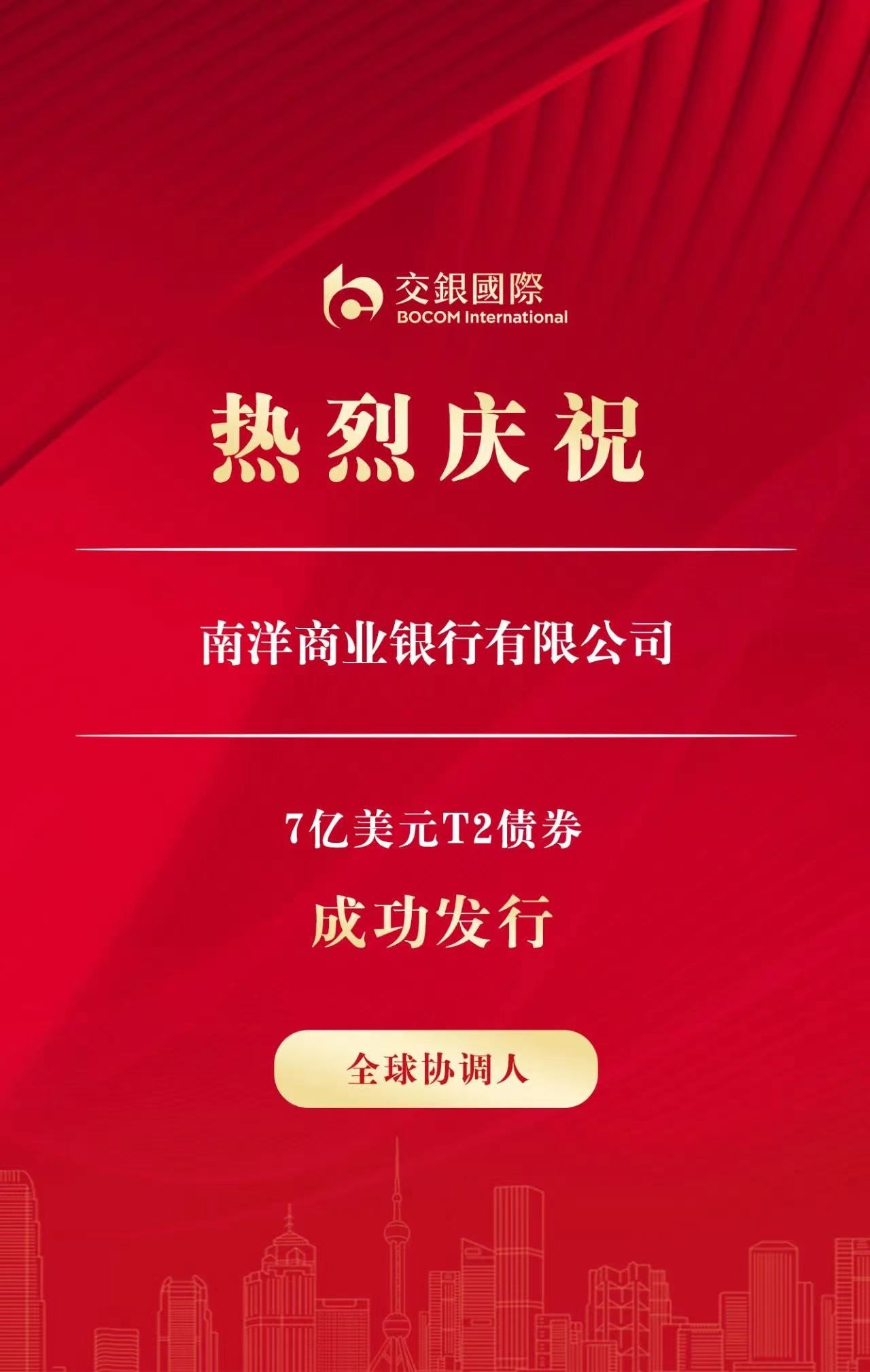 交銀國際作為全球協調人助力南洋商業銀行成功發行7億美元二級資本債券
